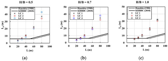 Based on the FEA results, the span (), design live load combination, intermediate diaphragm spacing (), cross-sectional aspect ratio (), and minimum requirements of diaphragm spacing () were determined, as listed in Table 3. All the required diaphragm spacings () were determined through regression analysis using third-order polynomial equations based on the analysis results shown in Figure 11c, Figure 12c, and Figure 13c. The intermediate spacings with 5% and 10 % normal stress limits are listed in Table 3. Additionally, Figure 14 and Figure 15 show comparisons between the design intermediate diaphragm spacings from the Hanshin Guidelines [5] and the Korean Design Code [26] and the minimum required intermediate diaphragm spacings () for different spans () and load combinations based on the FEA.