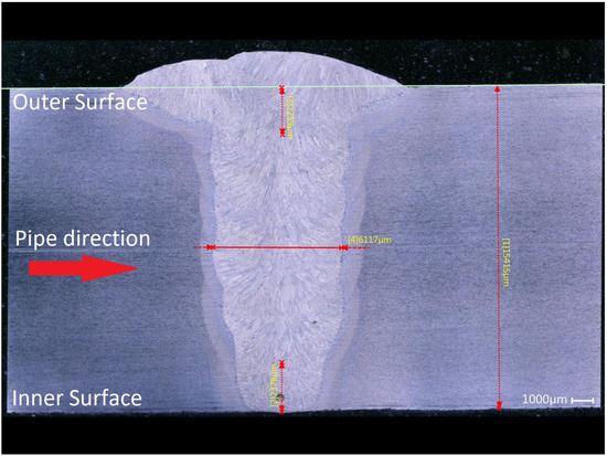 Weld macro overview of the girth weld including measurements of the wall thickness, weld thickness and thicknesses of the first and last weld passes.