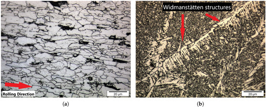 (a) Microstructure of the base metal (BM) consisting of polygonal ferrite with small pearlite islands (black). (b) Microstructure the weld metal (WM) consisting mainly of acicular ferrite with Widmanstätten ferrite at the prior austenite grain boundaries as indicated.