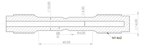 The setup designed in this work consists of a hollow specimen in combination with adapters that mount the specimen in an existing tensile tester, thus making it a simple, accessible test methodology. The loading frame used in this research was a Zwick Z100 electromechanical universal test machine equipped with a 100 kN load cell, combined with a Zwick digi-clip extensometer (gauge length 20 mm) and TestXpert II software. The specimen geometry is shown in Figure 3. The cylindrical specimen is machined from the pipe wall of the X60 pipeline steel such that the longitudinal direction of the specimen and the pipeline align. The hole into the specimen was reamed after drilling to create a smoother surface. Because of the orientation in which the samples were machined from the pipe wall, the girth weld region retains its orientation across the circumference of the specimen. If the specimen is considered as a miniature pipeline, the WM thus retains its original function as a girth weld. This results in equivalent loading directions of the weld between the test and actual operating conditions. A blind hole is machined through the specimen from one side, which is the containment volume for the hydrogen gas. The blind hole, the containment volume of the hydrogen gas, is dimensioned to prevent interference between the local stress fields around the edge of the hole and of the outer thread. Thus, failure outside of the gauge length is prevented. In the specimens that included a girth weld, a notch with a radius of 4 mm and a depth of 1 mm was machined to promote fracture in the weld region.