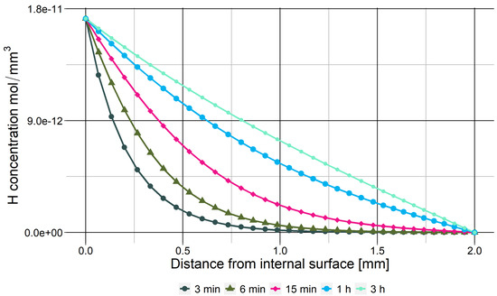 The evolution of the hydrogen concentration from the inside surface of the specimen during the pre-charging step was modelled in a diffusion model using standard quadratic axisymmetric heat transfer nodes (DCAX8). The inside surface of the modelled specimen was held at a concentration of 1.722 × 10 mol/mm3, which is the expected sub-surface concentration at 293 K and 100 bar according to Sieverts’ law [18,19]. Diffusivities for the BM and WM were taken as 2.25 × 10 mm2/s [15] and 2.9 × 10 mm2/s [42], respectively. The concentration at the start of the calculation was set to 0 mol/mm3 throughout the model to reflect the state of the specimen before starting the pre-charging step, after it has just been flushed with nitrogen. At the outer surface, Sieverts’ law states the concentration should be 0 because no H2 is present in the environment. Therefore, the outer surface was given the boundary condition of 0 concentration throughout the simulation. An explicit dynamic analysis was performed that allows for monitoring of the hydrogen concentration at the notch root plane over time. The evolution of the concentration gradient through the wall thickness is shown in Figure 5. The equilibrium state of a steadily decreasing H concentration towards the outside surface is reached after approximately 6 h. It is important to note that this model only shows the concentration profile for a sample without any deformation. The presence of elastic and plastic deformations will change the local equilibrium concentration continuously throughout the test. The deformation model serves as an indication of the stresses that will be present.
