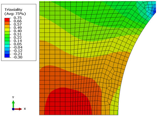An overview of the stress triaxiality distribution in the deformation model around the onset of necking.