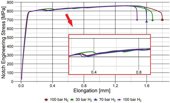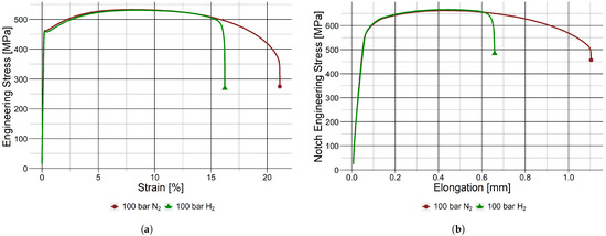 A significant loss of percentage elongation (%El) was found for the smooth BM samples tested in 100 barg H2 when compared to 100 barg N2, as can be seen in Figure 7a. A similar but more pronounced effect was observed in the notched BM samples, which is displayed in Figure 7b. The smooth samples show a reduction in %El of 25.4 ± 7.5% and an I of 27.9 ± 4.6% in a 100 barg H2 environment compared to 100 barg N2. The notched BM specimens show a decrease in elongation of 40.4 ± 13% and a reduction in %RA an I of 28 ± 4.7%. The pronounced decrease in elongation is an effect of the strain localisation in the notch, while the similar I values for both types of sample mean the triaxial stress state in the notch does not seem to influence the HE behaviour. For both specimen geometries, the behaviour of the tensile curve is unchanged before the onset of necking. This emphasises the importance of plastic deformation on HE, which increases hydrogen solubility because of an increased density of dislocations and voids [40,43,44]. The X60 BM is susceptible to HE at large plastic strains even though it is a tough and ductile steel. The %RA and I values for all sample sets are shown in Table 3.