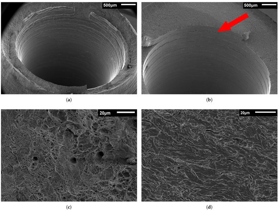 SEM Fractographic images of notched base metal samples. (a) Tested in 100 barg N2. (b) Tested in 100 barg H2. (c) Higher magnification image of smooth base metal samples tested without gas. (d) Higher magnification image of smooth base metal samples tested in 100 barg H2. Secondary cracks parallel to the fracture surface are present on the inside surface of the sample in (b), as indicated by the arrow.