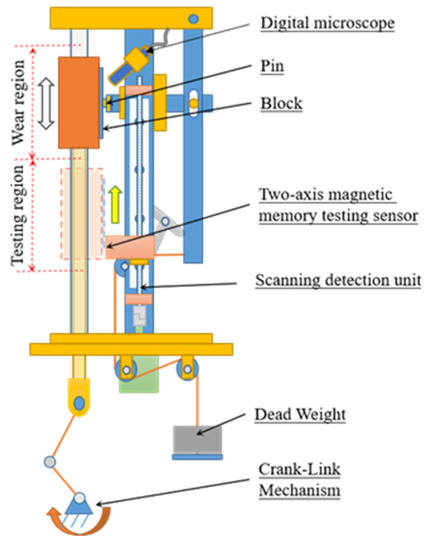 The experiments were carried out on a pin-on-block reciprocating sliding device. Figure 2 shows the schematic diagram of the experimental apparatus. The pin specimen is fixed on a pressure bar, which is perpendicular to the block surface and converts dead weight into positive pressure through a pulley mechanism. The block specimen is reciprocating in the wear region, relying on a crank connecting-rod mechanism. In the testing region, the variations of magnetic field were measured by a two-axis magnetic sensor that consists of two tunneling magneto resistive-type sensors; these have the merits of high sensitivity (12 mV/V/Gs) and a wide linear range. As shown in Figure 1, the normal component H(z) and the tangential component H(x) of the magnetic field were measured separately by a two-axis magnetic sensor. The positive direction of the normal magnetic field H(z) was chosen to point north. A CCD digital microscope was used to observe the tribological behavior.