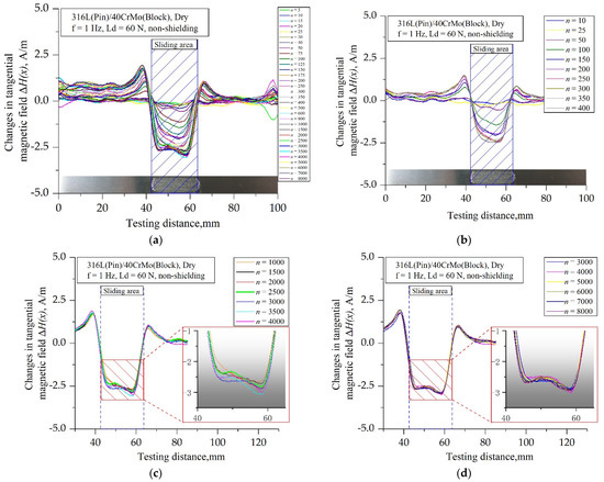Changes in the tangential magnetic field for different numbers of reciprocating strokes: (a) the whole process; (b) n = 10~400; (c) n = 1000~4000; (d) n = 3000~8000. (f as reciprocating frequency and Ld as the normal load.)