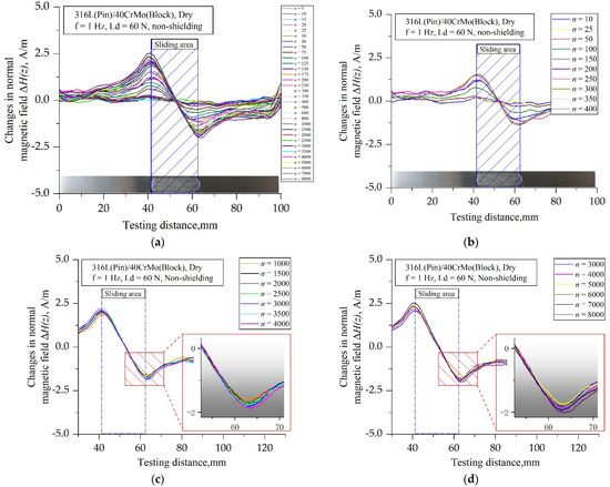 Changes in the normal magnetic field for different numbers of reciprocating strokes: (a) the whole process; (b) n = 10~400; (c) n = 1000~4000; (d) n = 3000~8000. (f as reciprocating frequency and Ld as the normal load.)