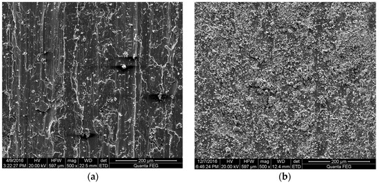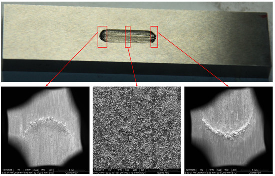 (3) Beyond point C, the coarse debris is ground repeatedly and is completely transformed into finer particles, some of which adhere to the surface of the wear scar. At the same time, because of friction heat, some fine black powder appears. Its admixture further reduces the frictional resistance, resulting in a decrease in wear rate. ΔH(x)mean then maintains a constant growth rate for a long period of time; this stage (C to D in Figure 6) is a stable wear period. The main mechanism of friction magnetization in the stable wear period is self-leakage magnetic field [11]. Figure 9 shows the micro morphology of the wear scar surface before and after point C.