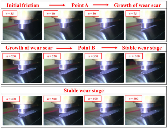 (2) After point A, ΔH(x)mean increases rapidly until point B. Referring to Figure 8, it is found that point B corresponds exactly to the time when the wear scar is completely formed, so the A-to-B stage can be considered as the growth period of the wear scar. The width and depth of the wear scar increase during this period, and the boundary of the wear scar becomes clear. In addition, friction will produce some debris particles. At point B, the shape of the debris is sharp, and the particle size is large. The debris and the pin-block friction pair constitute a three-body wear mechanism, which has a high wear rate. Accordingly, ΔH(x)mean shows rapid growth from A to B.