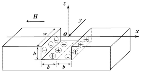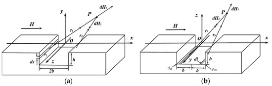 In this model, a Cartesian coordinate system is selected, and the coordinate origin O is located on the upper surface of the workpiece at the midpoint above the wear scar, as indicated in Figure 10. The geomagnetic field is H, the length of the wear scar is 2b, and the depth of the scar is h. Therefore, the magnetic field intensity vectors of the surface element ds on both sides of the wear scar at point P are as follows: