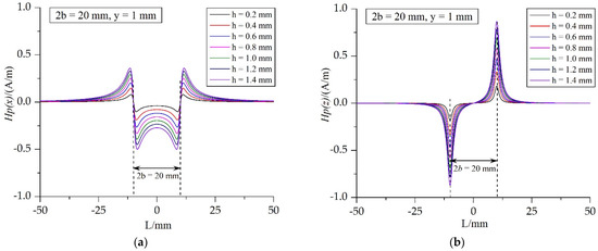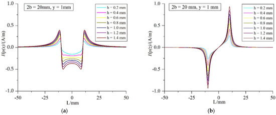 In order to simplify the calculation, let . Additionally, take the wear scar length to be 2b = 20 mm and the sensor lift-off value to be y = 1 mm. According to relevant experimental results of W.C. Zhong, ≥ 8 [28,29]. Here, (k = 0.1), and the magnetic field leakage on the surface of the block specimen with different abrasive depth is numerically simulated according to Equations (11) and (13). The results are shown in Figure 13 and Figure 14.