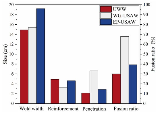 The geometric parameters of welds obtained by three methods are statistically shown in Figure 3. Notably, the weld width of EP-USAW reaches to 19.23 mm, 28.9% higher than that of UWW, which gained the smallest value among the three of them. Meanwhile, the weld reinforcements were 4.93 mm, 3.3 mm and 4.62 mm. The ionization degree of plasma in the arc may climbed to a high level due to the decomposition of a large number of alkali metal oxides in the water glass, which increased the arc force impacting the effect on the molten pool. As a result, both the penetration and fusion ratio of the WG-USAW joint reached the maximum values, 6.63 mm and 67.9%, respectively.