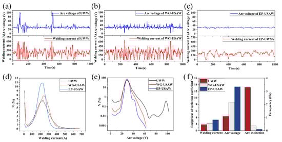 Analysis of welding process electrical signals. (a–c) waveforms under different conditions; (d,e) probability density distribution of welding current and arc voltage; (f) reciprocal variation coefficients and arc extinction frequencies.
