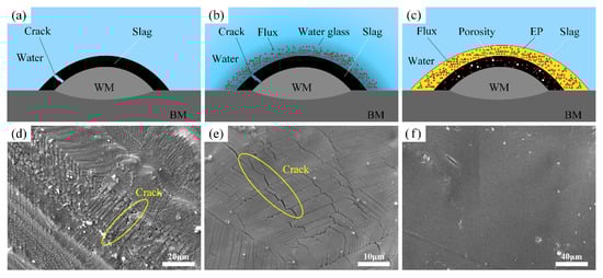 Crack propagate through the slag of UWW and WG-USAW, which makes the weld metal be directly exposed to the water environment at relatively high temperature, as illustrated in Figure 5a,b. Removing the remaining mixture afterwards, it was found that the relatively dense slag without cracking was integrated with part of epoxy resin and flux in EP-USAW, as shown in Figure 5c. SEM results show that there were many cracks between the dendritic grains of slag in UWW and WG-USAW, while the slag morphology of EP-USAW was smooth and crack-free, as shown in Figure 5d–f, respectively.