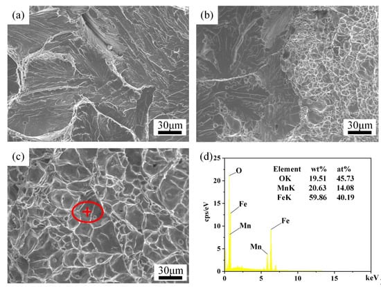 The average room temperature impact toughness values of the three joints are 40.4 J/cm2, 53.2 J/cm2 and 68.3 J/cm2. The toughness enhancement of WG-USAW and EP-USAW joints can be attributed to not just the protection from the mixture and solid slag but also the microstructure optimization of weld metal. SEM results show that river-like patterns occupy the fracture surface of impact samples in UWW, indicating a typical cleavage fracture mode, as shown in Figure 9a. Surprisedly, both river-like patterns and dimples are observed in the fracture surface of WG-USAW, as shown in Figure 9b. They are full of dimples with minor internal inclusions on the ductile fracture surface of EP-USAW, as marked in Figure 9c. EDS result shows that these inclusions are mainly composed of ferro and manganese oxides, as shown in Figure 9d.