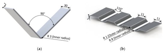 Target geometries with dimensions in mm: (a) sheet formed by V-bending; (b) sheet formed by groove pressing.