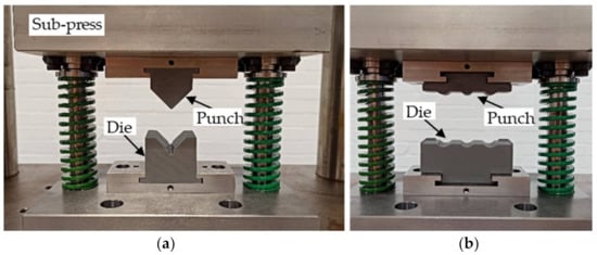 Both forming processes were carried out in an electric press with a maximum capacity of 150 kN. A sub-press, designed for use with interchangeable tool inserts and is shown in Figure 2, is used to ensure proper guidance of the printed forming tools during forming. All experiments were conducted to fixed end positions with a vertical press speed of 3 mm/s.
