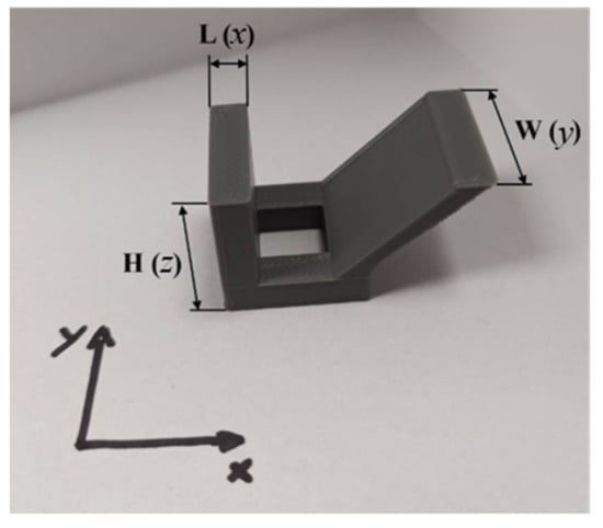 Reference geometry used to determine printer accuracy with dimensions L × H × W: 5 mm × 20 mm × 20 mm. The printing direction is in z.