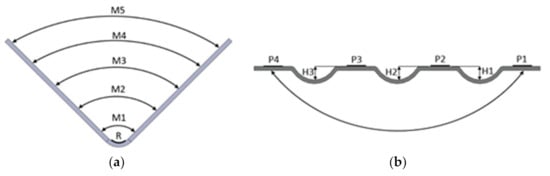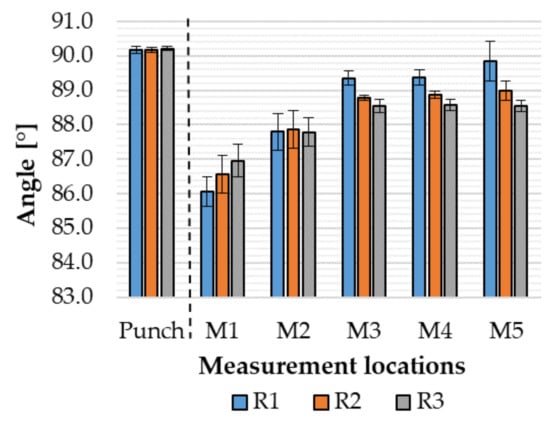 The nominal geometry of the component created by V-bending is shown in Figure 1a. The measurement strategy used to determine the geometrical accuracy of the formed component is outlined in Figure 5a. Five measurements of angles (M1–M5) are performed along the arms of the bent components at equal intervals of 6 mm. The radius (R) where the arms meet is also measured.