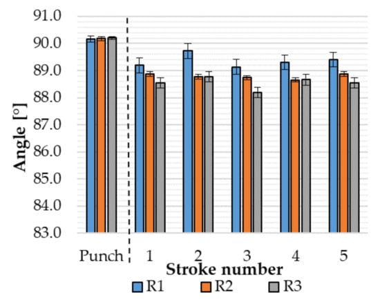 Figure 8 shows the average angle measured in location M3 of the workpieces, over five strokes, for the three different punch nose radii. The largest difference from nominal is found when using the 3 mm radius tool after three strokes, where the measured value is 88.2 ± 0.8°. The smallest deviation from nominal is found when using the 1 mm radius tool at the second stroke, where the measured value is 88.7 ± 0.27°. The workpieces formed by the 2 mm radius tool have small deviations among them and a steady response over the five strokes, characterized by a standard deviation of 0.08°. This behavior is not observed for the workpieces formed by the 1 mm and 3 mm radii tools.