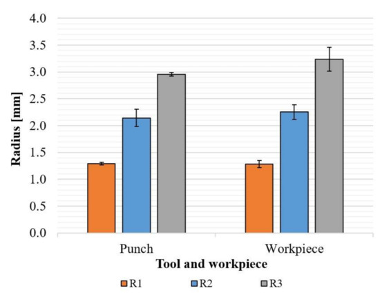 Another aspect of the accuracy is the bend radius that is achievable by 3D-printed tools. Three different radii are tested in V-bending, with results shown in Figure 9 and Figure 10. The bend radii of the workpieces as function of the number of strokes in the same tool is shown in Figure 9. Figure 10 shows a comparison between the radius of the printed tools and the radius measured on the formed components. The nose radii of the R1 and R2 tools are not nominal, but the formed component adopts the measured nose radius closely. The scatter of measurements is also low, indicating that the repeatability is good. This implies that the deviation from nominal in the formed components is due to the accuracy of the printed tools, which could be compensated for. The R3 tool is different, in that the radius of the tool is close to nominal, but the radius of the formed component is not. The scatter in the measured radius is also larger than for components formed using the R1 and R2 tools. The shell thickness that is used when printing the tools is 2.1 mm for all punches regardless of the punch nose radius. As larger punch nose radius implies a larger contact area towards the workpiece, the constant shell thickness results in less stiff behavior from the punch nose when the radius is increased. The corresponding larger elastic deflection of the R3 tool would explain the increased radius and scatter measured on the bent workpieces.