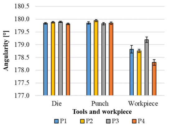 Figure 12 shows the angularity measured between the features that nominally sit on the same plane. The nominal angularity is therefore 180°. The figure shows that the tools are close to nominal. The average angularity measured on the workpiece is far from the nominal value of 180° due to spring-back and varies between the features. The largest deviation was observed on P4, which has an average value of 178.3 ± 0.12°. P3 has the closest value to nominal by 179.2 ± 0.11°. Spring-back after the nominally symmetric groove pressing is expected to increase angularity deviation from nominal with distance from the center. This explains why the deviation is larger in P4 than in P3. However, Figure 12 also shows that this cannot explain P1 and P2, because there is no symmetry in the resulting angularities. Since the tools are symmetrical in terms of angularity with respect to each other, the asymmetric angularity in the workpiece is due to the asymmetric groove heights in the tools, as shown in Figure 11.