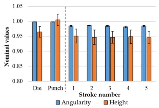 The performance of the tools was also investigated over a small number of strokes. In this case, as mentioned in Section 2.4, the overall workpiece angularity is described by the angle between P1 and P4 and the reported height is an average value of H1, H2 and H3. Figure 13 shows the measured dimensions normalized with respect to the nominal values. The stability and repeatability of the measured values are good.