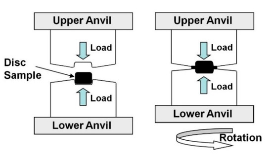High-pressure torsion (HPT) is a severe plastic deformation (SPD) method [1], which is widely used to generate nanograins or ultrafine grains (UFG) in metallic materials [2]. In this method, as schematically shown in Figure 1, a small disc sample is compressed between two anvils under a pressure of several giga-Pascals and, concurrently, shear strain is introduced in the sample by rotating one of the anvils with respect to the other one (γ = 2πrN/h, γ: shear strain, r: distance from disc center, N: anvil turns, h: sample thickness) [1,2]. The method was originally introduced by Bridgman in 1935 [3] to examine polymorphic phase transformations under high pressure (see the historical development of the HPT method in [4,5]). In 1988, Valiev et al. [6] introduced the HPT method as an SPD technique to achieve nanograined microstructures in metallic materials. This study resulted in the development of the Nano-SPD field [7] and accelerated the research activities on the HPT method by many other research groups [8,9,10,11].