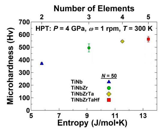 In another attempt, González-Masís et al. [78] synthesized TiNb, TiNbZr, TiNbZrTa and TiNbZrTaHf alloys from the elemental powders using the HPT process. These alloys were selected because of their biocompatibility and their tendency to form single body-centered cubic (BCC) phases. All materials showed the formation of fully BCC structures with the presence of nanograins. In addition to the successful synthesis of materials by the HPT method, they reported that there are increases in hardness when increasing the configurational entropy or the number of elements, as shown in Figure 3. Detailed analyses confirmed that these hardness changes cannot be justified only by conventional strengthening mechanisms such as solution hardening, dislocation hardening, grain-boundary hardening and precipitation hardening, because the ternary, quaternary and quinary alloys in Figure 3 had similar nanograin sizes, similar dislocation densities and similar atomic-size-mismatch parameters [78]. Since the steady-state hardness of HPT-processed metals is their intrinsic property and depends on the atomic bonding energy [79], and since this energy can be reduced by increasing the entropy [43,44], it was hypothesized by González-Masís et al. that high configurational entropy and a decrease in the internal energy of the system can also influence the steady-state hardness of HEAs [78].