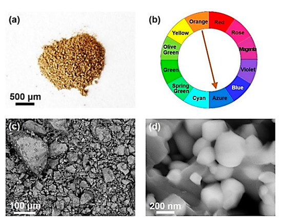 (a) Powder image, (b) Itten color wheel corresponding to orange color of powder, and (c,d) micrographs of powders by scanning electron microscopy for dual-phase high-entropy oxide TiZrHfNbTaO11, synthesized by high-pressure torsion and high-temperature oxidation, reproduced from [76], with permission from ROYAL SOCIETY OF CHEMISTRY, 2020.