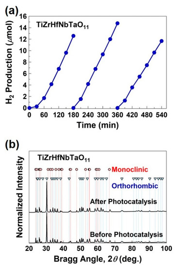 (a) Photocatalytic hydrogen production for three cycles and (b) X-ray diffraction patterns before and after photocatalysis for dual-phase high-entropy oxide TiZrHfNbTaO11, synthesized by high-pressure torsion and high-temperature oxidation, reproduced from [76], with permission from ROYAL SOCIETY OF CHEMISTRY, 2020.
