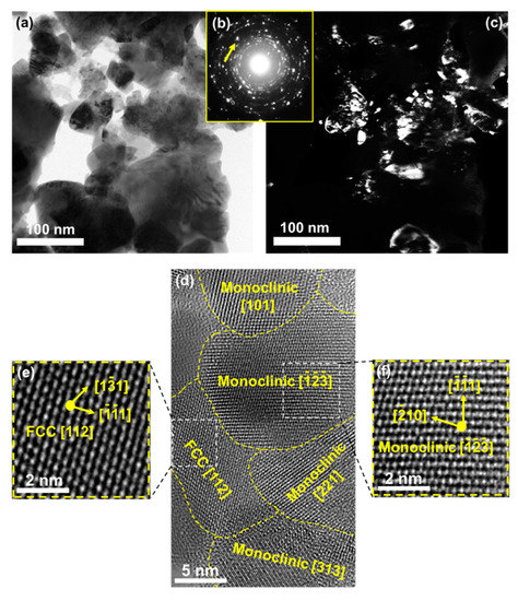 (a) Bright-field image, (b) selected area electron diffraction pattern, (c) dark-field image, (d) high-resolution image, (e) lattice image of FCC phase and (f) lattice image of monoclinic phase taken by transmission electron microscopy for nanograined dual-phase high-entropy oxynitride TiZrHfNbTaO6N3, synthesized by high-pressure torsion followed by high-temperature oxidation and nitriding, reproduced from [77], with permission from ROYAL SOCIETY OF CHEMISTRY, 2021.