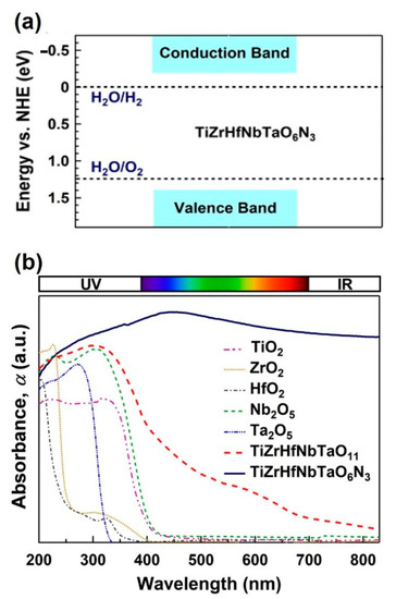 (a) Band structure compared with required potentials for water splitting, and (b) light absorbance compared with binary and high-entropy oxides for nanograined dual-phase high-entropy oxynitride TiZrHfNbTaO6N3, synthesized by high-pressure torsion followed by high-temperature oxidation and nitriding, reproduced from [77], with permission from ROYAL SOCIETY OF CHEMISTRY, 2021.