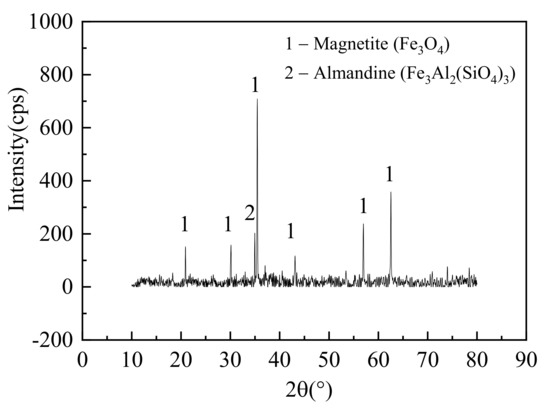 The magnetite sample from a Chinese ironmaking company was used as a raw material in this study. The sample was ground and screened to three size ranges (105~150 μm, 80~105 μm, and <80 μm). The screened samples were heated to 105 °C and held for 6 h to remove the moisture, and then were stored in the dryer with anhydrous silica gel particles. The chemical compositions of the magnetite sample were analyzed via an X-ray fluorescence spectrometer (XRF, ARL Advant’X Intellipower 3600, Thermo Fisher Scientific, Waltham, MA, USA) and are shown in Table 1. The mineralogical information of samples was analyzed by using a D/MAX 2550-VB/PC X-ray powder diffractometer (XRD, Malvern Panalytical B.V, Almelo, The Netherlands). The XRD analyzer used a Cu target and continuous scanning mode, and the diffraction angle of 2θ ranged from 10° to 80°. The XRD spectrum of the magnetite sample is given in Figure 2. The main phase was mainly magnetite (Fe3O4).