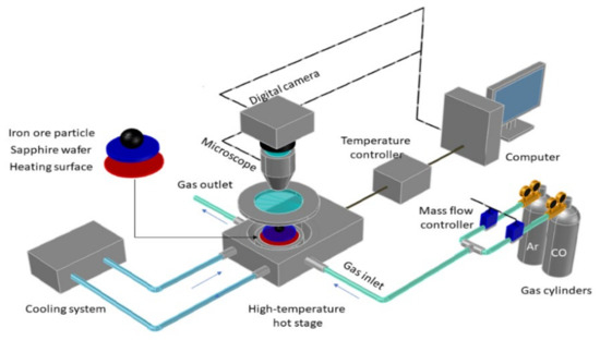 The reduction experiment of magnetite particles was carried out in a high temperature hot stage microscope (HTHSM), and the diagram of the experimental apparatus is shown in Figure 3. The high temperature hot stage microscope system included a DM4500P LED microscope with digital camera (Leica, Solms, Germany), a high temperature hot stage (Instec, MK2000, Boulder, CO, USA), gas transport system, cooling system and a computer. The temperature calibration before the experiment was carried out to ensure the accuracy of the setting temperature, with reference to the melting temperature of the silver (purity 99.9%). The relative error of the temperature calibration was controlled below 0.03% by repeating the experiments more than three times.