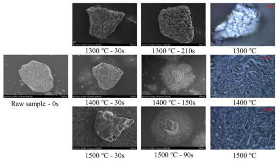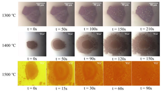The reduction processes of the magnetite particles at different temperatures in CO atmosphere are shown in Figure 4. The results showed that the total reduction time of a single magnetite particle was about 90 s at 1500 °C while this time at 1300 and 1400 °C was 210 and 150 s, respectively. This indicated that the increase of the reduction temperature would produce benefit by reducing the reduction time. At 1300 °C, metallic bright spots were found on the particle surface, and these spots were missing at 1400 and 1500 °C. At both 1400 and 1500 °C, part of the reduction products was melted to liquid and flowed out of the particle to form a layered structure on the sapphire wafer. Root-like metallic luster substances appeared on the surface around the solid particle. The proportion of the area of the melted product to the observation field increased with the reduction time and temperature, indicating that more products were melted to liquid at a higher temperature. Therefore, during the high-temperature reduction process of a single magnetite particle, a layered structure appeared around the particle, which is like an “egg”, accompanied by the reduction of the molten layer and the simultaneous reduction of central solid parts.