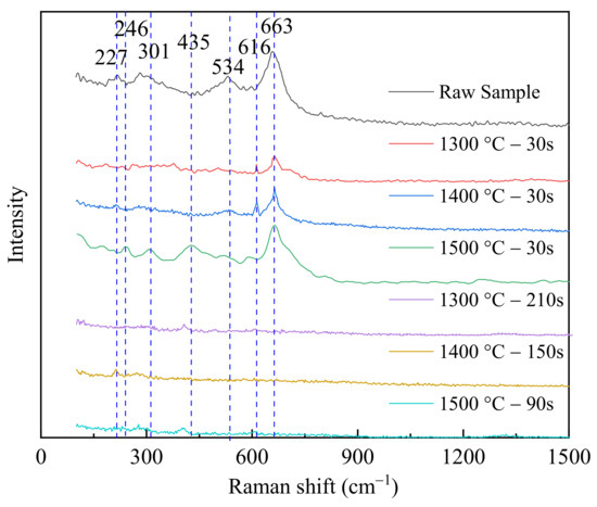 The magnetite particle before/during/after the reduction process was analyzed by Raman spectroscopy (DXRTM Raman Spectroscopy, Thermo Fisher Scientific, Waltham, MA, USA) to determine the product type. The Raman spectra of the analyzed samples are shown in Figure 5. The standard Raman shifts of iron oxides are also given in Table 2. Compared to standard Raman shifts in Table 2, the raw sample, namely the magnetite particle, before reduction was mainly Fe3O4, corresponding to the results of XRD spectrum in Figure 2. The Raman shifts of the raw sample tested in this study were 301, 534, and 663 cm−1, which were same as the data from the literature [24,25]. Moreover, less Fe2O3 was found from the Raman spectra in Figure 5, corresponding to 227 cm−1. Although the silicone oil could seal the product, fewer reduction products detected from the Raman spectroscopy were not completely similar with the standard shifts of FeO, and FeO was not stable and easily transformed as Fe2O3 or Fe3O4. After the magnetite particle was reduced by CO at 30 s, two peaks corresponding to the Raman shifts of 616 and 663 cm−1 [24,25] were found in the tested samples at 1300 and 1400 °C, respectively. This indicated that magnetite was reduced to wüstite within a short time, about 30 s. When the reduction temperature was 1500 °C, more peaks were found in the spectrum, such as 435, 616, and 663 cm−1. The higher temperature benefited the reduction from Fe3O4 to FeO. When the reduction was completed, the Raman spectra of samples showing a line without peaks was shown in Figure 5. Therefore, it was verified that the single particle was fully reduced to Fe after the experiment in HTTSM. The main controlling step was the reaction (R2) with the lower reaction rate from FeO to Fe.