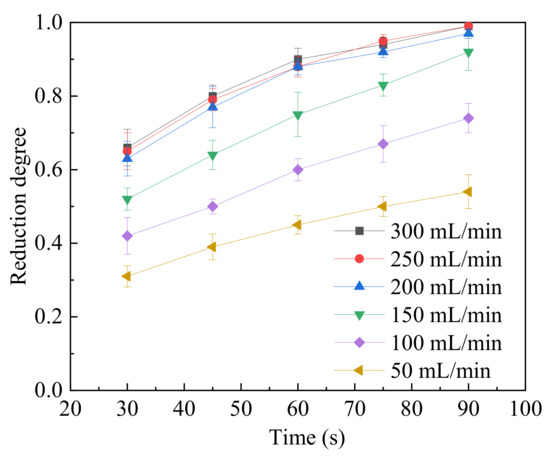 The effect of gas flowrate on the reduction of magnetite particles was studied and the results are shown in Figure 7. The operating temperature was set to 1500 °C. The magnetite samples were reduced within different time frames (30, 45, 60, 75 and 90 s) to calculate the evolution of the reduction degree. Then, the mass fraction ratio of O to Fe was detected by energy spectrum and calculated from Equation (2). Error bars are also given in Figure 7. The gas flowrate ranged from 50 to 300 mL/min. The reduction degree increased with the increasing gas flowrate from 50 to 200 mL/min. When the gas flowrate was above 200 mL/min, the reduction degree at each tested time point did not change much from 200 to 300 mL/min. This indicated that the external diffusion effect on the reaction was minimized when the gas flowrate was above 200 mL/min. To ensure the minimized external diffusion effect, a gas flowrate of 250 mL/min was chosen in this study. Compared to the results from the study of Chen et al. [26], the external diffusion effect on the reduction of iron ore fines could be removed when the gas flowrate was 300 mL/min. Their experimental temperature was set to 700 °C. In this study, the temperature was much higher than the value in the literature [26], and the increasing reduction temperature also enhanced the diffusion of gas diffusion from the ambient phase to the particle surface, causing diffusion to proceed more quickly.