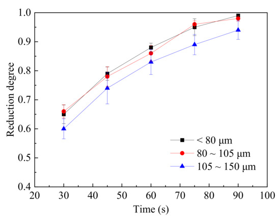 The study on the effect of different particle sizes on the reduction degree of the magnetite particles was carried out, and the results are shown in Figure 8. The gas flowrate was set at 250 mL/min herein, minimizing the effect of external diffusion, and the time spots for the measurement were also set as 30, 45, 60, 75 and 90 s. The operating temperature was set to 1500 °C. Results calculated from Equation (2) showed that the reduction degree increased with the decrease of the initial particle size. For the fine magnetite particle (<80 μm or 80~105 μm), the reduction degree displayed a similar tendency. However, when the particle size increased from 105 to 150 μm, the reduction degree decreased obviously. Large particles have a longer diffusion path for gas than fine particles, resulting in the reduction of the magnetite particles with larger particle size (>105 μm) being controlled by the internal diffusion of the reactant gas. Furthermore, at high temperatures, the reduced product or slag were melted and hindered the reducing gas diffusing into the internal zone of the particle, especially for the coarse particles.
