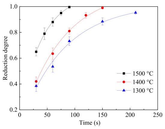 To study the effect of temperature on the reduction degree, the magnetite particles with size of 80 μm and gas flowrate of 250 mL/min were chosen in this study. According to the results from the previous sections, the internal/external diffusion effects were minimized. The results of the reduction degree at different temperatures from 1300 to 1500 °C were calculated and are shown in Figure 9. The reduction reaction was controlled by the chemical reaction under this condition. From Figure 9, with increasing temperature, the reduction degree increased obviously from 1300 to 1500 °C. At 1500 °C, the total reduction time was about 90 s while the reduction time at 1300 and 1400 °C was prolonged to 150 s and 210 s, respectively. High temperature benefited the reduction of magnetite and reduced the reduction time from the results in Figure 9. Additionally, the formation of a melted surface increased the contact area with the gas, which promoted the reaction.