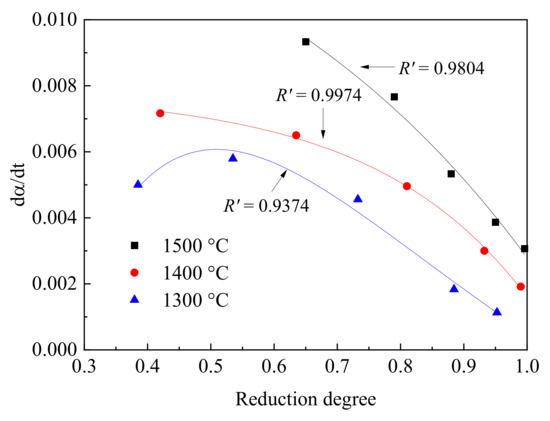 The relationship of reduction rate (dα/dt) and reduction degree at different temperatures. R′ denotes the correlation degree.