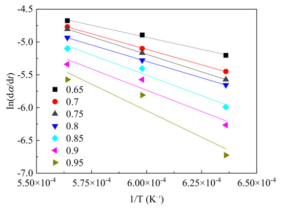 ln(dα/dt) versus 1/T at different reduction degrees.