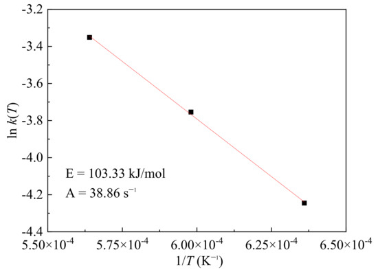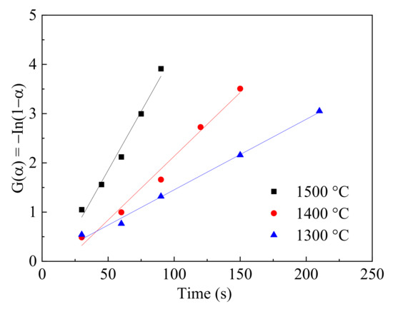 According to the results, the external/internal diffusion effect on the reaction was removed by controlling the gas flowrate and particle size. Therefore, the total reaction was controlled by the chemical reaction kinetics. The reaction was assumed as a first-order reaction and G(α) = −ln(1 − α) [30]. The linear fitting at three different temperatures is given in Figure 12 and the degree of fitting (R2) was 0.9758, 0.9793 and 0.9931, respectively, which proved the availability of the model in this study.
