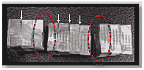 Figure 3. Shear localization and fracture after two passes of MCSTE β 40° processing. Red ovals point at Full separated sections of the billet and white arrows point at shear localization initiated at the peripheries of the billets.