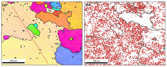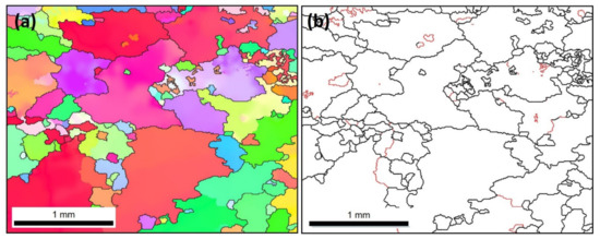 Figure 4. (a) IPF coloring map and (b) grain boundary map with high-angle grain boundaries (HAGB) >15° in black lines and LAGB 2°–15° in red lines for AA AA5083 acquired at 10 µm for a square area of 3 × 3 mm2.