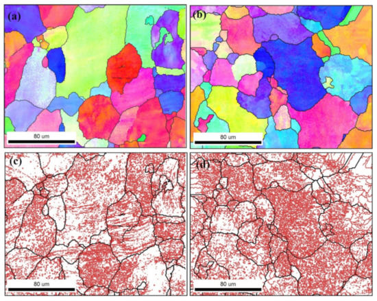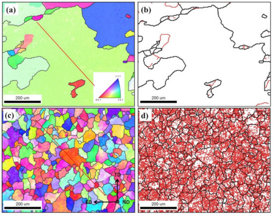 Figure 6. IPF coloring map and grain boundary map with HAGB > 15° in black lines and LAGB 2°–15° in red lines for AA5083 processed with 1-pass MCSTE; (a,c) at the edge of the sample and (b,d) at the center of the sample.