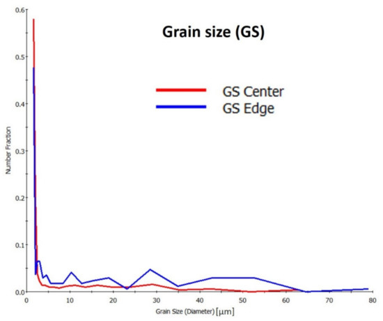 Additionally, the distribution of grain size in terms of number fraction is illustrated in Figure 7, which shows a slightly higher number fraction of ultrafine grains at the center than at the edge. On the other hand, the number fraction of large grains of the HAGBs is higher at the edge than at the center as it can be observed from the chart starting from grain size about 5 µm up 60 µm the curve of the of grain size distribution for the edge data (blue curve) is higher than that for the center data (red curve). This might reflect a slightly higher rate of recrystallization at the edge than at the center of the sample.