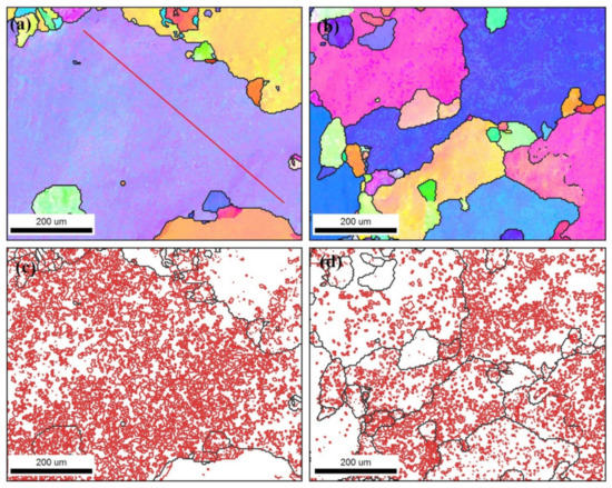 Figure 8. IPF coloring map and grain boundary map with HAGB > 15° in black lines and LAGB 2°–15° in red lines for AA5083 processed with 2-passes MCSTE; (a,c) at the edge of the sample and (b,d) at the center of the sample. The red straight line on the IPF maps indicates the line at which the misorientation profile is obtained.