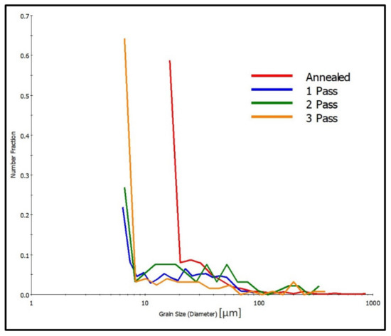 Figure 10. The grain size distribution chart for AA5083 processed with the as-annealed and 1-pass, 2-passes and 3-passes MCSTE processes. No of grains for the AA, 1 pass, 2 pass and 3 pass are 34, 342, 68, and 39 respictively.