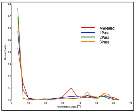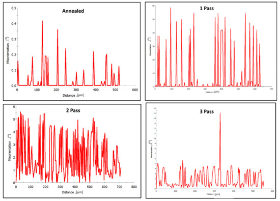 The misorientation profile is also obtained at the red lines indicated on the IPF maps (Figure 5, Figure 8 and Figure 9) and presented in Figure 12. This misorientation profile obtained along the red lines shown on the IPF maps indicates the presence of a high density of LAGBs observed after 2–passes and 3-passes of processing in comparison with the free LAGBs observed in the AA plate.